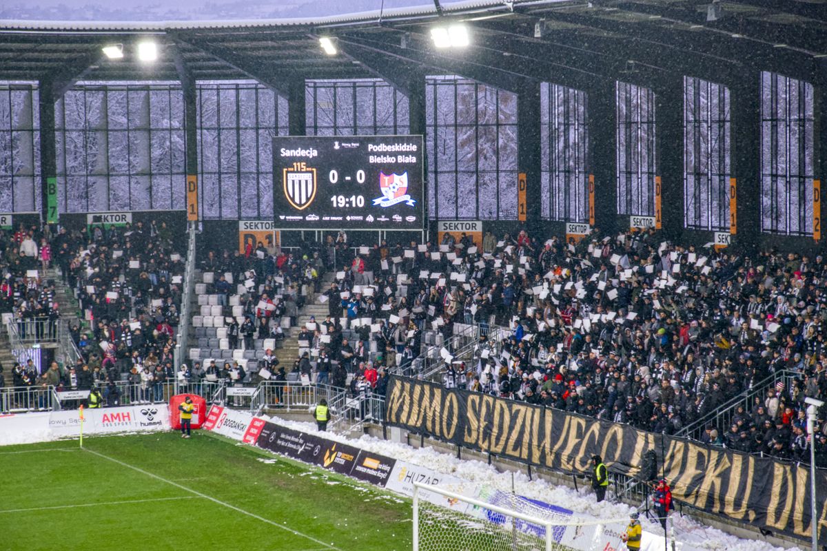 Za nami ostatni mecz rundy jesiennej na Stadionie Miejskim w Nowym Sączu. Choć spotkanie Sandecji Nowy Sącz i Podbeskidzia Bielsko-Biała zakończyło się bezbramkowym remisem, to emocji i gorącego dopingu na trybunach nie brakowało!