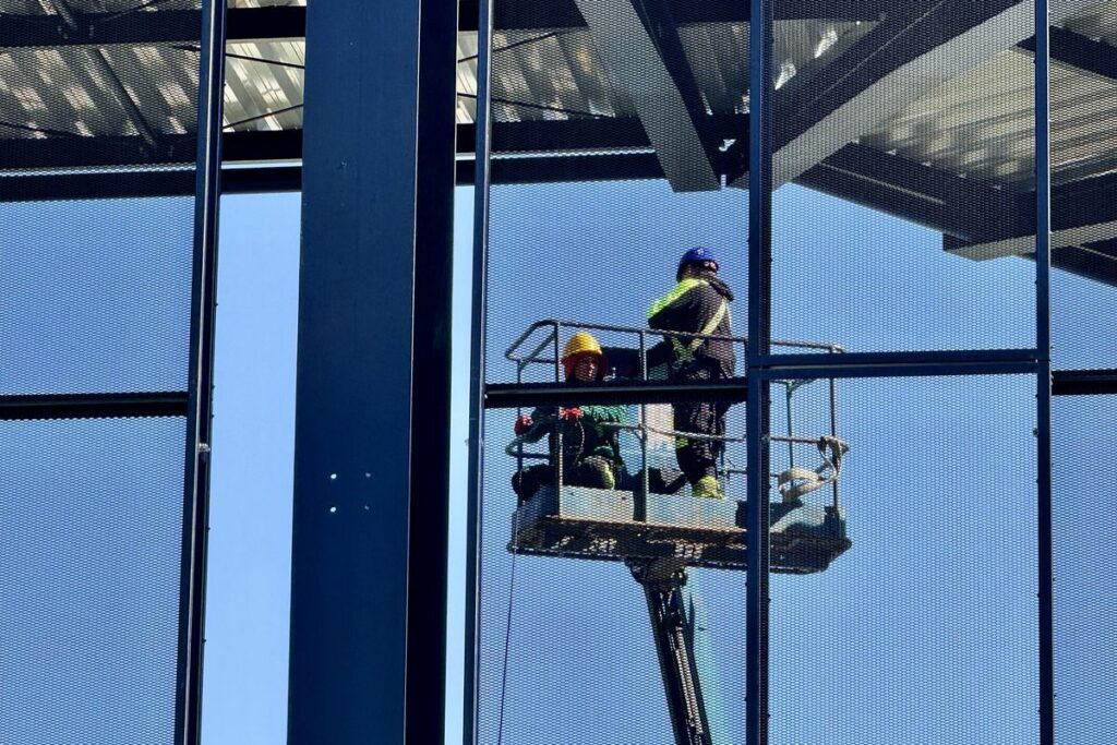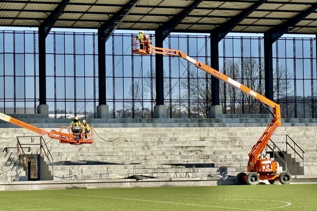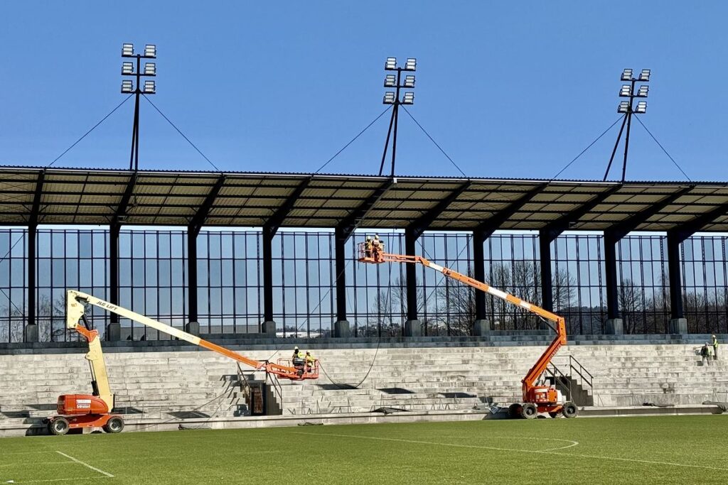 Prezes spółki NIK Dawid Janik wyjaśnia, że po zakończeniu ważnych prac związanych z ułożeniem zadaszenia trybun, ekipa elektryczna prowadzi prace instalacyjne przy oświetleniu trybuny B.
