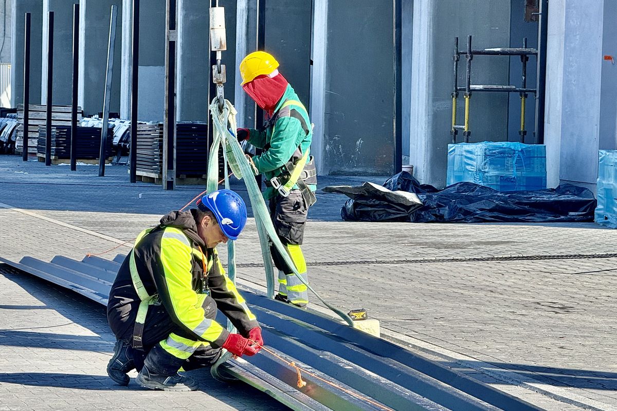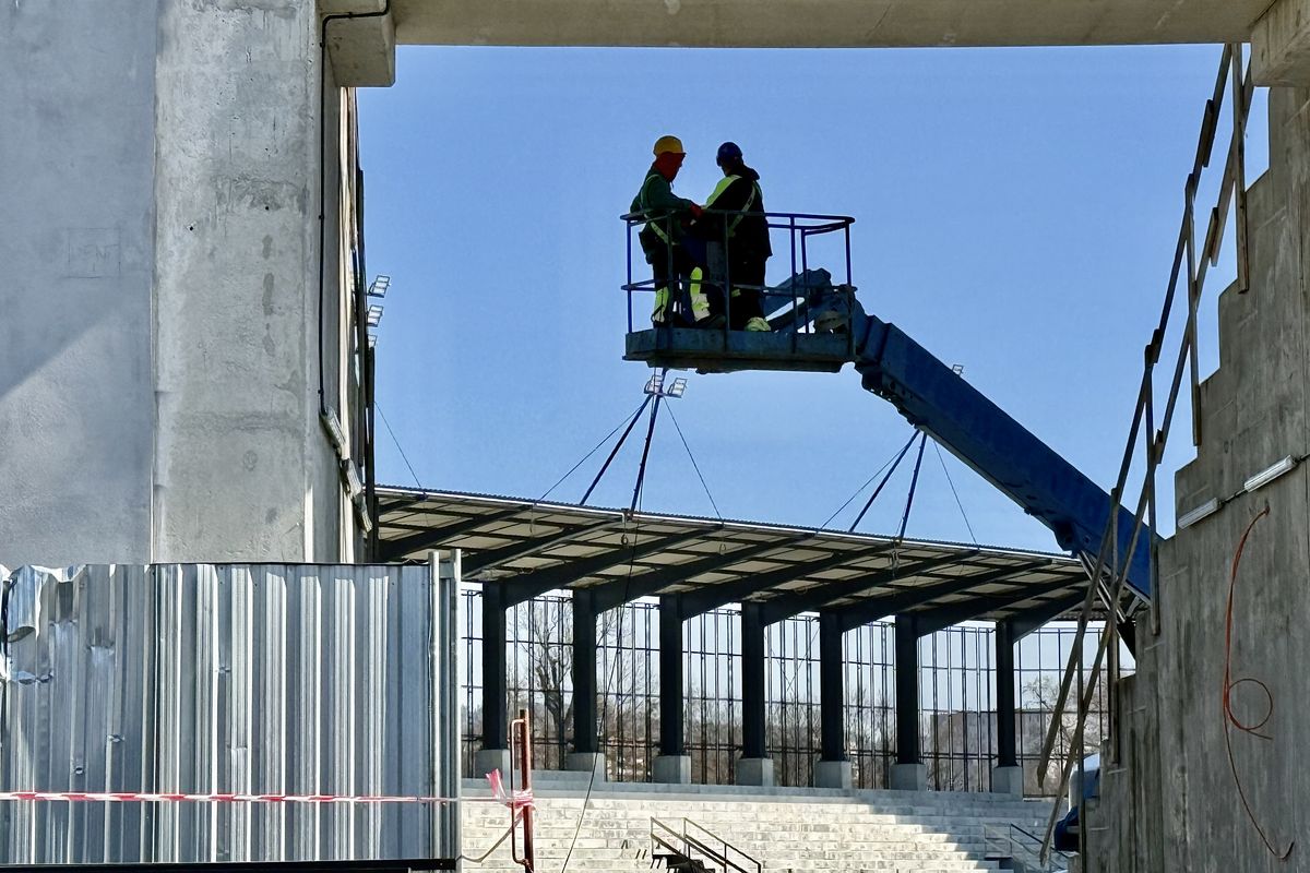 Prezes spółki NIK Dawid Janik wyjaśnia, że po zakończeniu ważnych prac związanych z ułożeniem zadaszenia trybun, ekipa elektryczna prowadzi prace instalacyjne przy oświetleniu trybuny B.